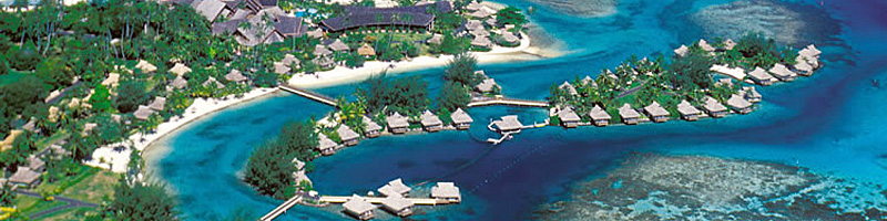 Intercontinental Tahiti, formerly known as the 'Beachcomber', is a delightful oceanfront resort on the west coast of Tahiti with the nicest overwater bungalows on the main island and several pleasant artificial beach settings and lagoonarium. This natural aquarium that unique in the South Pacific. When building the “Fare I’a reservation”, the resort recreated the under water conditions found in the ocean by providing a constant flow of sea water. and Intercontinental Tahiti Resort has introduced corals, shells and tropical fishes, the resort now has over 200 sea species of all sizes and colors. This very delicate ecosystem is regularly controlled and monitored by a team of scientists and you are invited to discover this under water paradise : parrot fishes, picasso, rays, and angel fishes. The large reception area offers a balcony with sweeping views over the ocean and towards Moorea. There's one huge swimming pool in front of the hotel and another smaller pool fronting the ocean. The hotel boasts one of the best Polynesian dance performances in French Polynesia. The Polynesian style resort with its own private sand beach and lagoon, offers views of unforgettable sunsets over the Volcanic peaks of sister island Moorea, just 12 miles across the sea of moons. Moorea Intercontinental Resort & Spa 5-Star Close to Opunohu Bay on the northeast coast of the island, sheltered from the prevailing winds, the InterContinental Resort and Spa Moorea is located voluptuously between the mountains and lagoon. Situated in the heart of a verdant setting of 11 hectares (27 acres), these magnificent gardens contain 165 different species of trees, plants and flowers. Confided to the talented hands of French architect Pierre-Jean Picart, who loves Polynesia, the hotel underwent a big renovation project that was finished in September 2002, with very pleasing results. The 17 Garden Suite Bungalows, the 50 Overwater and 28 Beach Suite Bungalows(also called "fare"), as well as the 48 Garden View Rooms, were all decorated with a concern of combining a respect for the local traditions with non-conspicuous contemporary luxury. Noble woods and natural materials were elegantly used in the decor. These include parquet or bamboo, Méranti of Indonesia partitions, mahogany and wicker furniture and natural coloured wall coverings. The furniture of distinguished and original lines, as well as objects made from Tahitian arts and crafts, (paintings, tapas...) compose a refined and harmonious ensemble and reinforce the Polynesian identity of this dream hotel. The only impediment to tradition (for the comfort of our guests), are the "fare" and rooms are all provided with a very modern air-conditioning system. Besides the classic island excursions and a wide choice of nautical and sports activities, the hotel also offers more original activities such as the “Moorea Dolphin Center”, an incredible aquatic park where guests can swim and play with the dolphins. There is also "Hélène’Spa", a centre of well-being that was the first Tahitian spa in Polynesia, and suggests a range of care treatments in small gorgeous “Fare” that are generously open to the surrounding nature. Everything here was conceived to transform your vacation into an album of unforgettable souvenirs for lovers and families. Accommodation Our Moorea Resort has 143 accommodation units, all with the same standards of comfort, luxury and a Polynesian theme decor. There are four categories to choose according to your taste. The Lanai Rooms are located in the mainbuilding. The 48 Lanai Rooms and 1 suite in the main hotel building and these are closer to the central core of resort facilities. They are comfortable and spacious, measuring 323 sq ft (30 sq m) excluding terraces or balconies that give on to the luxuriant resort gardens. They all have double beds that may be separated as two twin beds. We have 1 Lanai Suite, a unit that is double the size of the standard rooms with an additional balcony, furnished with loungers. Restaurants & Bars Room Service: Food and beverages may be served to your room or bungalow upon request from 6.30 am to 11.00 pm. If you are staying in an Overwater Bungalow, don't forget to order a canoe breakfast. It's paddled to you fare, across the lagoon and served bty a charming vahine on your private terrace. Entertainment To give you an authentic taste of Polynesia, we present a program of regular dinner shows in whih dinner is followed by an excinting performance of the inimitable Tahitian dances. Activities The following services are provided in the hotel. * Hélène'Spa |
