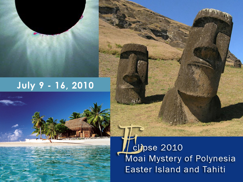 Join us in July, 2010 for an eclipse tour full of mystery and fantasy. Watch the 4:37 eclipse with the Moai of Easter Island, then relax in pure luxury at 5-star island resorts of Polynesia's finest on Tahiti and Moorea. Enjoy only the finest in accommodation aboard our specially chartered A340-300 Air Tahiti Nui aircraft with available business and first class upgrades and the pleasant nature of the polynesian staff.